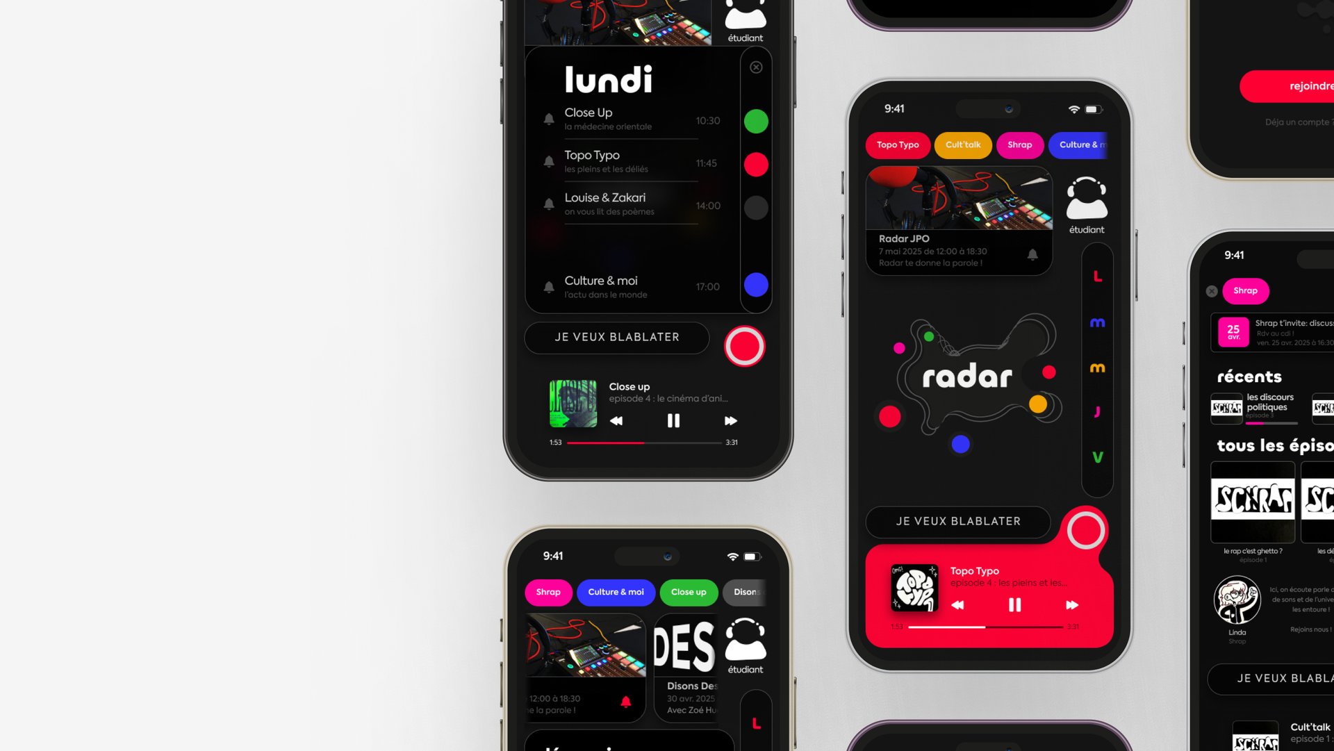 As part of my Graphic Design degree, with a focus on digital media, I was responsible for designing the interface of Radar’s mobile application.
