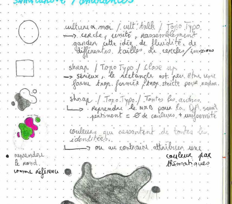 Circles of varying sizes and positions reflect the diversity of contributions — from freedom of expression to active participation within the association. The colors reference the microphones and visually represent the variety of radio shows.